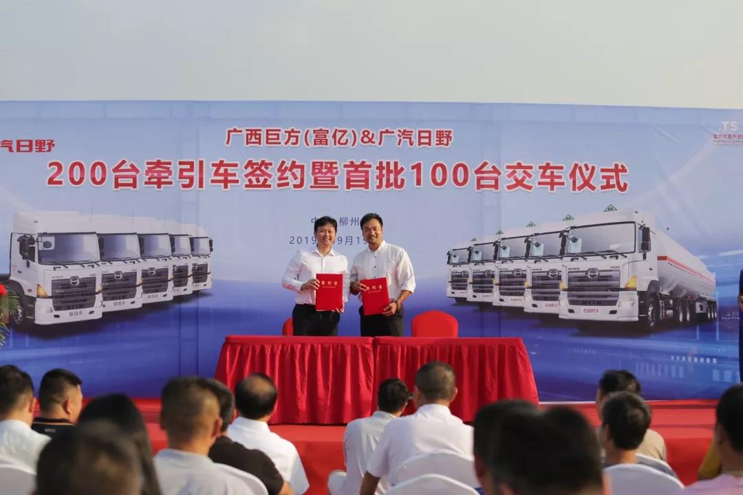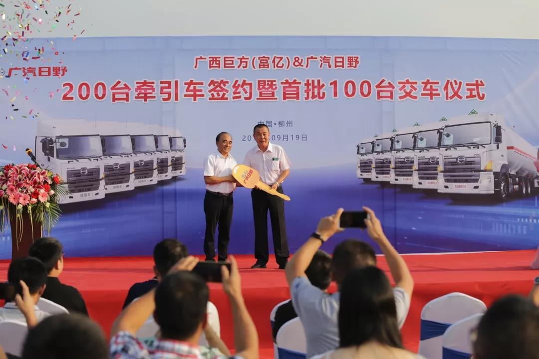 2019年9月19日,广汽日野汽车有限公司与广西巨方物流有限公司200台700牵引车暨首批100台交付仪式在广西柳州隆重举行,双方公司经营层和当地及周边运输行业的精英共同见证这一激动人心的时刻。