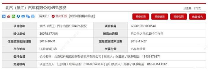 北汽集团与麦格纳重组北汽(镇江)汽车有限公司项目有了最新进展。据北京市产权交易所披露的公告显示,北汽集团将出售北汽(镇江)汽车有限公司49%的股权,交易底价约为3亿元。