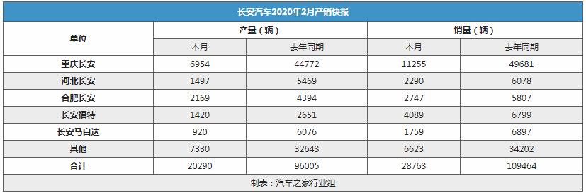 据中汽协的数据显示,2020年2月,乘用车销售共计22.4万辆,同比下降81.7%,全年累计同比下降43.6%。因此,长安汽车虽然受到淡季和疫情影响,产销量出现下降,但2月表现好于行业整体情况。其中,长安汽车三大生产基地重庆、河北和合肥销量分别为11255辆、2290辆和2747辆,合计销售16292辆,占2月总销量的56.64%,长安福特销售4089辆,长安马自达销售1759辆。