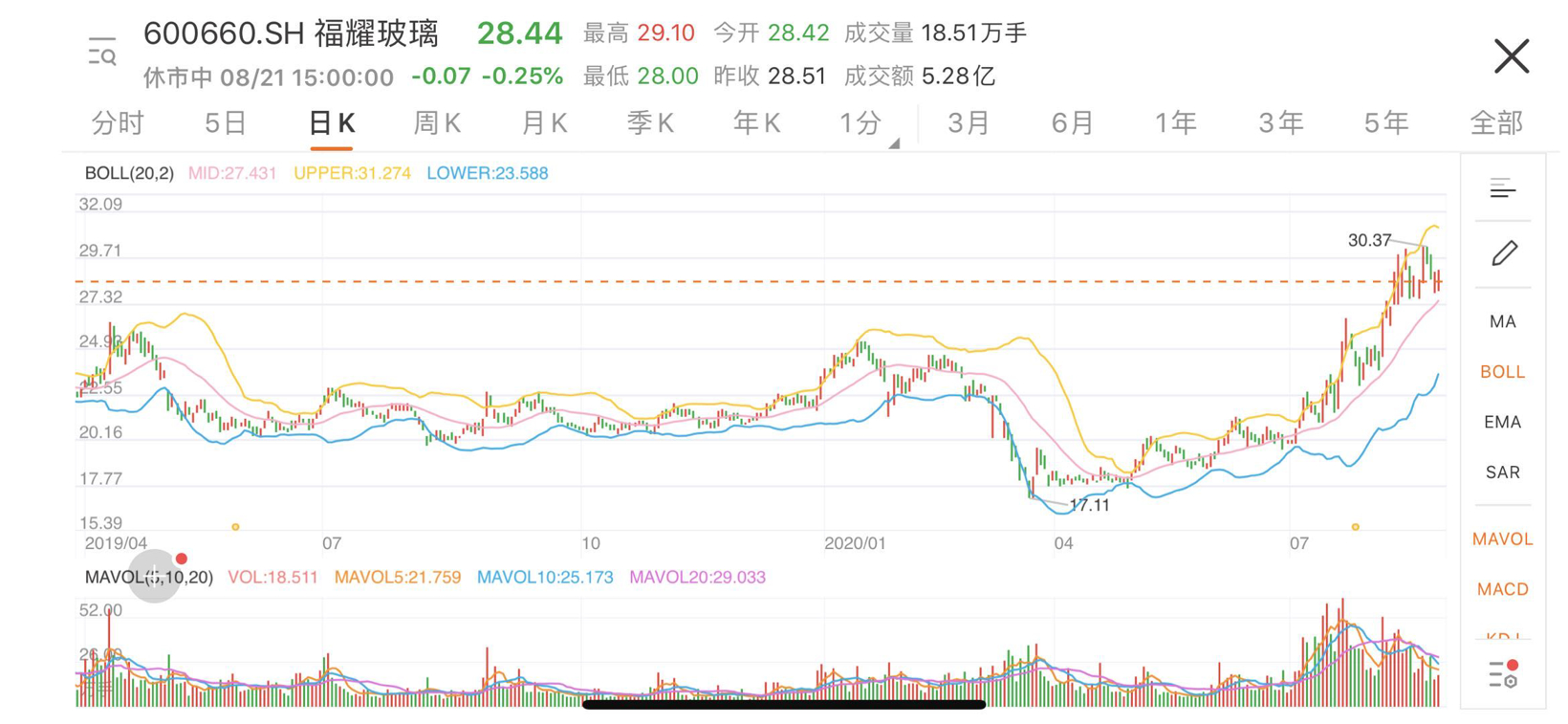 尽管业绩仍未低迷,但自今年6月以来,福耀玻璃的股价却在持续上涨,截止8月21日,其股价收于28.44元,期间曾突破30元每股,突破了2018年1月的历史高点,较4月末反弹已经超过50%。