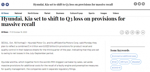 现代起亚Q3盈利将减3.36万亿韩元 因质量问题成本支出