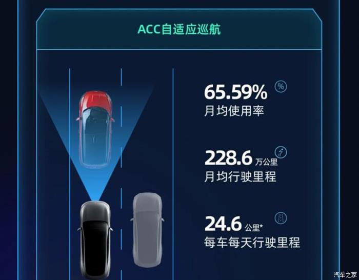 在辅助驾驶方面,自动泊车月均使用次数达到了8.8万次,ACC自适应巡航月均行驶里程为228.6万公里(月均使用率 65.59%),LCC车道居中保持月均行驶里程为112.7万公里(月均使用率42.48%)。
