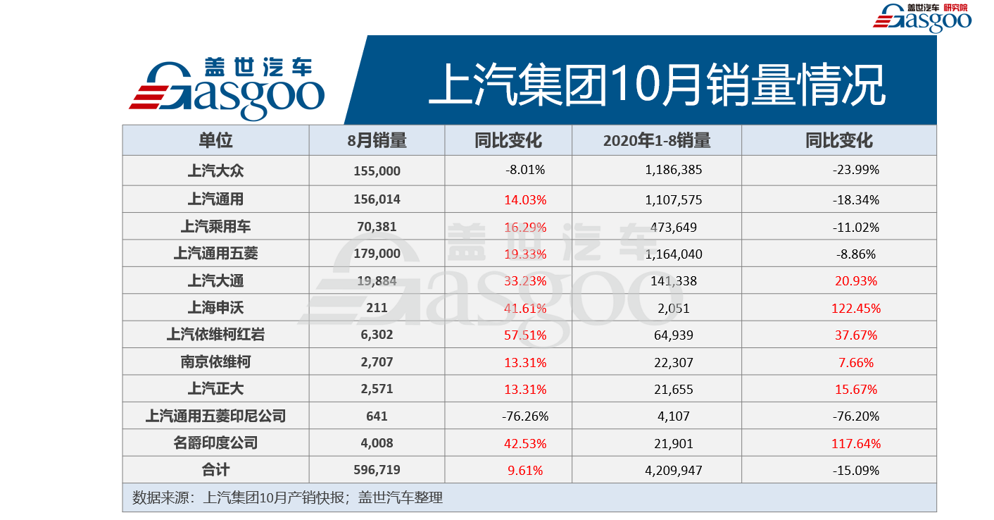 上汽集团10月销量59.7万辆,同比增长9.61%