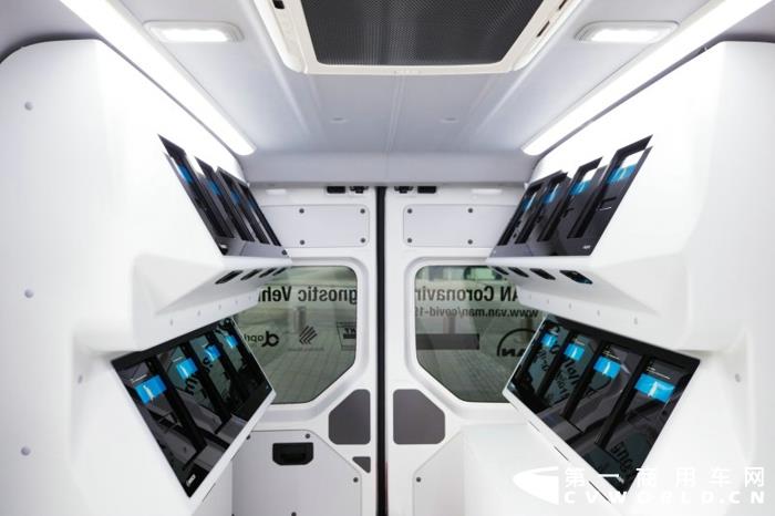 长轴距版本最大优势是高度灵活。车内设有拭子取样专用空间,车身两侧装有遮阳篷,可以提供额外的空间,便于更快速、频繁地更换作业地点。长轴距版本配备8台核酸检测设备。为保证进行拭子取样时,人员在车内单向通行,曼恩TGE配备了两个自动横向滑动门。