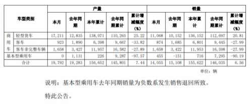 东风汽车基本型乘用车11月产量为零,去年同期为1131辆;1-11月累计产量仅200余辆。乘用车11月销量为455辆;前11月累计销量仅为716辆,同比下滑90.19%。