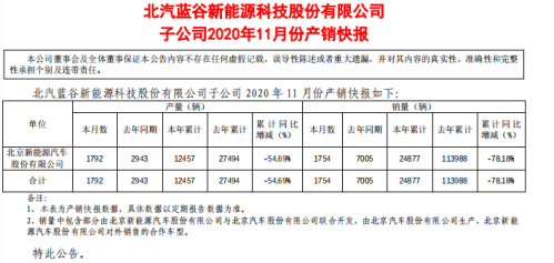 12月10日晚,北汽蓝谷发布公告,子公司北汽新能源11月销量为1754辆,相较去年同期的7005辆,下滑74.9%;前11月累计销量为24877辆,同比下降78.18%,而去年同期为11.4万辆。