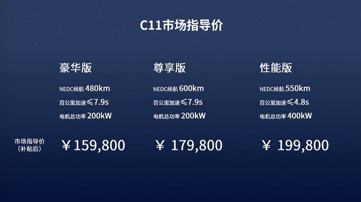 12月28日,零跑C11正式公布售价,新车将有豪华版、尊享版和性能版三个版本可选,新车补贴后的售价区间为15.98万-19.98万元。此外新车还提供八年或12万公里超长质保政策,并将于2021年第四季度交付。三个版本分别搭载了76.6kWh和90kWh两个容量版本的三元锂电池包,NEDC续航里程分别为480km、600km和550km。