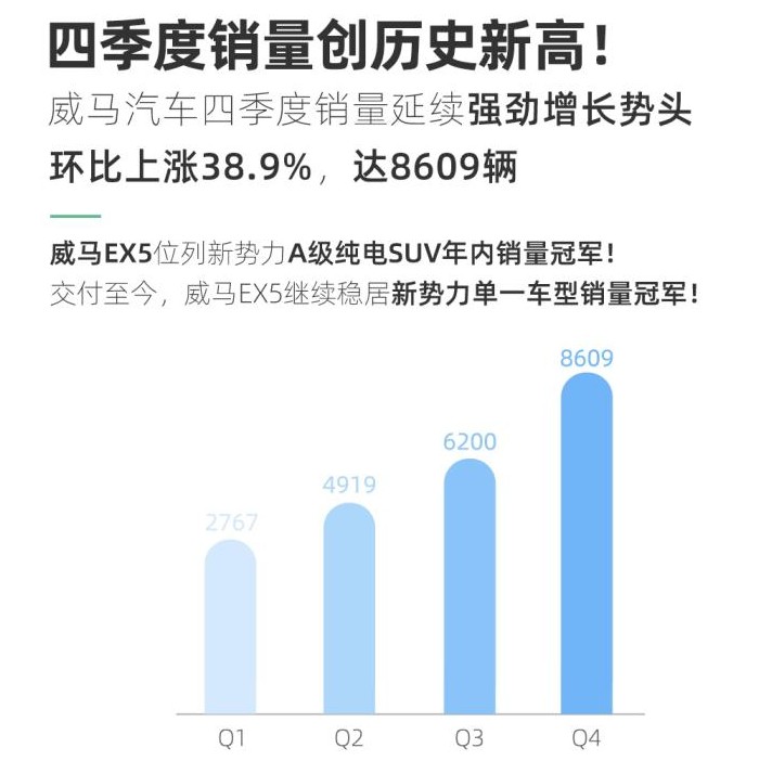 根据官方数据,2020年威马汽车全年累计销量达22495辆,同比增长33.3%,其中第四季度的销量达8609辆,环比上涨38.9%。此外,旗下首款纯电SUV威马EX5自2018年9月启动交付至今,累计销量突破4万辆。
