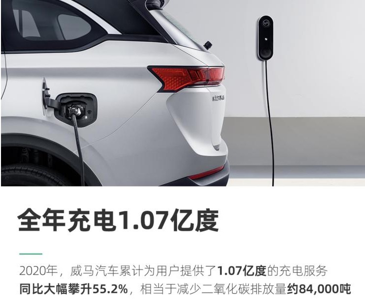 据威马大数据平台显示,2020年威马汽车累计为用户提供了1.07亿度的充电服务(数据涵盖威马为用户提供的免费家用充电桩累计充电数及威马汽车旗下即客行APP公共充电服务数据),同比大幅攀升55.2%。同时,通过7次OTA升级,威马汽车为用户新增、迭代了百余项亮点功能。
