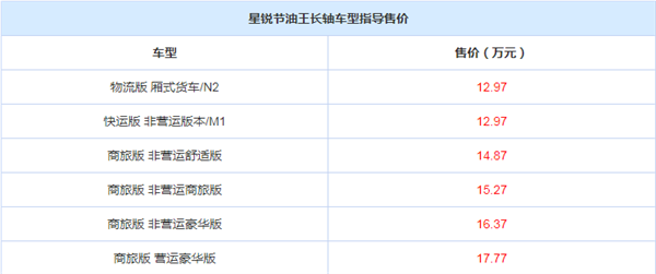 近日,我们从官方获悉,星锐节油王长轴车型正式上市,新车主要是针对动力进行升级,共推出6款车型,售价区间为12.97-17.77万元。