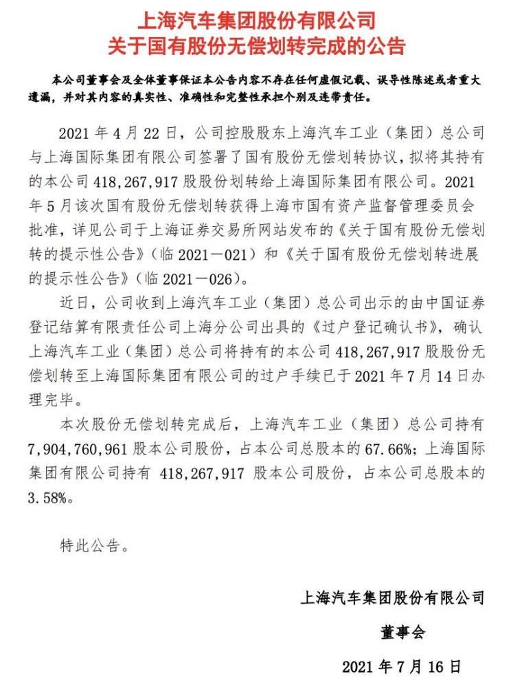 近日,公司收到上海汽车工业(集团)总公司出示的由中国证券登记结算有限责任公司上海分公司出具的《过户登记确认书》,确认上海汽车工业(集团)总公司将持有的本公司418,267,917股股份无偿划转至上海国际集团有限公司的过户手续已于2021年7月14日办理完毕。