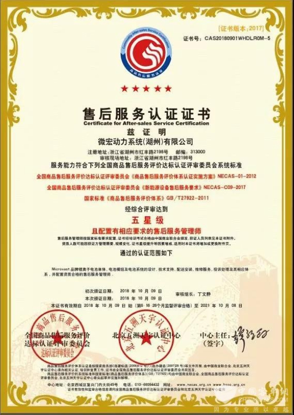 2018年10月8日,微宏动力系统(湖州)有限公司通过北京五洲天宇认证中心的评审,以高分获得售后服务水平认定,并正式获颁认证证书,成为国内锂离子动力电池行业为数不多的五星级售后服务企业,这标志着微宏动力在领先的技术与产品实力之外,在售后服务方面也有了一张王牌。 [详细]