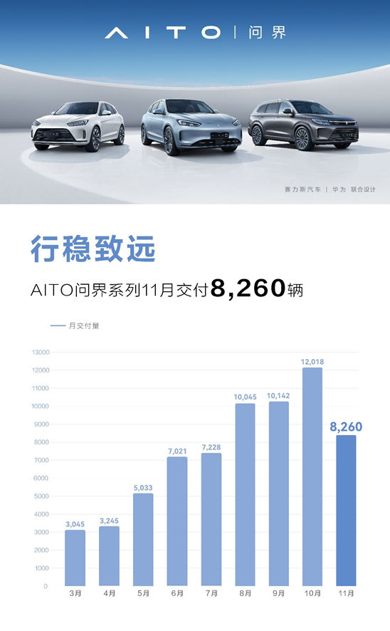2022年12月1日,赛力斯汽车公布了问界系列交付数据,11月共完成车辆交付8260辆。数据显示,2022年3-11月,问界系列累计交付达到66037辆。