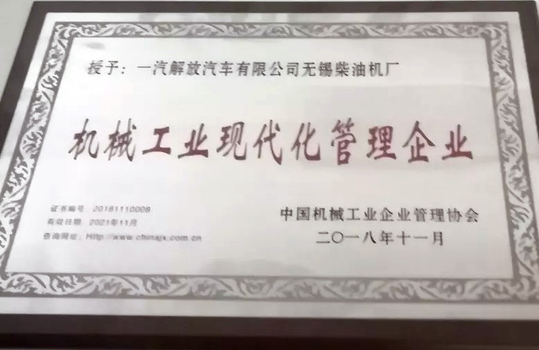 在中国机械工业企业管理协会七届六次理事(扩大)会期间,一汽解放发动机事业部(原一汽解放汽车有限公司无锡柴油机厂)的代表就一天两次登上领奖台。先后获得了“机械工业现代化管理企业”和“2018年中国机械工业500强”两项荣誉。 [详细]