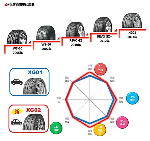 普利司通在2005年将冰锐客系列轮胎正式引入国内,并在2018年推出了XG02系列轮胎,与2014年的XG01轮胎相比,XG02在冰路和湿路制动、干路操控、使用寿命等方面都有所提升。