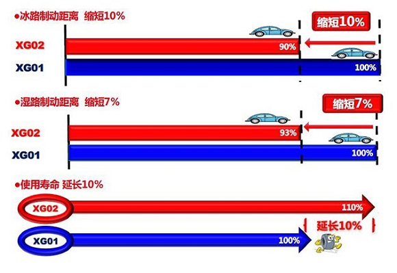在冰路的制动距离上,XG02相比XG01缩短了10%;在湿路制动距离方面,XG02相比XG01缩短了7%;而在使用寿命方面,XG02相比XG01则延长了10%,可以说XG02在性能的全方位上都有所提升。