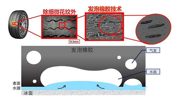 普利司通冰锐客轮胎采用了发泡橡胶技术进行制作,使得轮胎在同样的低温环境下,具有更柔软的特性,同时轮胎的寿命也可以更长。此外,发泡橡胶技术的另一大好处,是可以在胎面上设有气室,这些气室可以在冰雪路面行驶时消除胎面与路面之间的水膜。