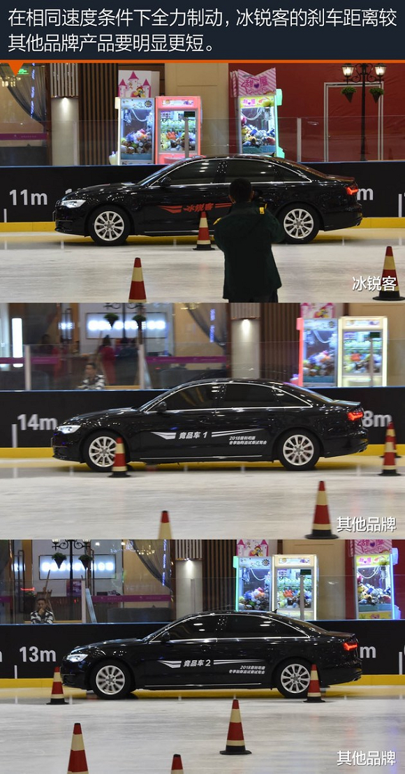 在绕8字项目中,使用其他品牌轮胎的车型在绕环时只要稍踩油门,车辆就会出现打滑偏离的迹象,而使用冰锐客的车辆做相同动作时,油门踩到三分之一后才会出现打滑偏离,因此可以说明冰锐客提升了车辆在冰雪路面的转弯极限。