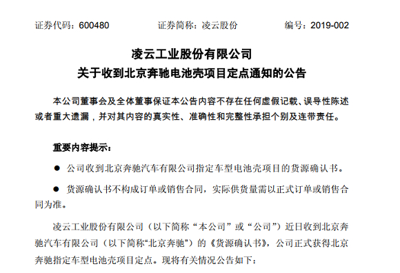 凌云股份:确认为北京奔驰指定车型电池壳/盖项目供应