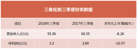 10月26日,三角集团有限公司发布了2018年三季度财务报告。报告显示,三角轮胎2018年前三季度营业收入55.4亿元,同比下降8.26%,净利润为3.3亿元,同比下降10.57%。