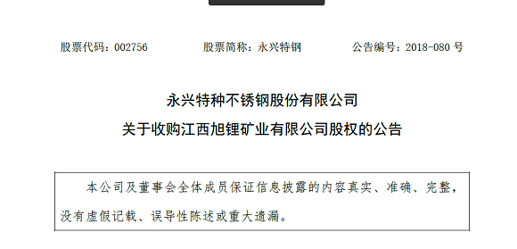 11月7日,永兴特钢发布公告称,公司拟以1.97亿元收购江西旭锂矿业有限公司(以下简称“旭锂矿业”)81.4%股权。此前,其已经2017年7月通过增资已持有旭锂矿业12.2%的股权,本次交易完成后,将持有旭锂矿业93.6%股权,旭锂矿业将成为其控股子公司。
