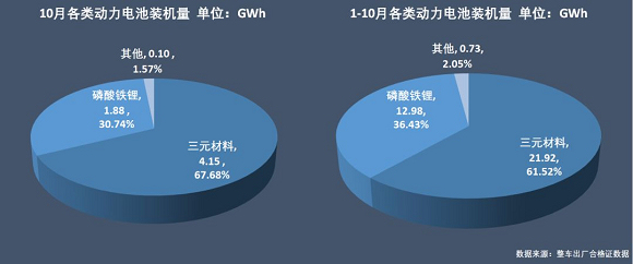 今年1-10月累计,国内新能源汽车动力电池累计装机量35.68GWh,同比增长103.08%,已经翻番,且接近去年全年的装机量(36.24GWh)。三元材料电池累计装机了21.92GWh,占比61.52%,较去年同期累计增长153.29%;磷酸铁锂电池累计装机12.98GWh,占比36.43%,累计同比增长65.1%。