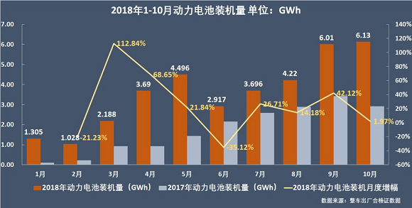 10月份,国内新能源汽车动力电池装机量6.13GWh,较上月微增1.97%,环比增幅从上月的42.12%降至本月的1.97%;同比去年则大幅增长110.58%。