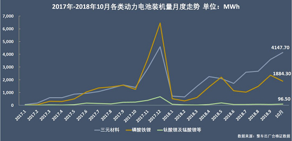 10月锰酸锂和钛酸锂电池合计装机96.5MWh,其中,客车搭载的钛酸锂电池装机增长了23.53%,锰酸锂电池在专用车的装机增长了419.18%,这两类动力电池装机量是有所增长,但权重终究式微,对行业市场影响不大。