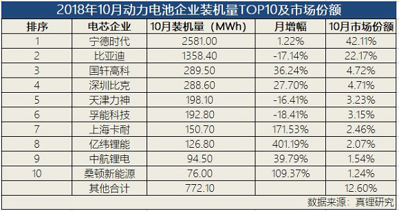 值得注意的是,9、10两个月,除了宁德时代和比亚迪,没有一家电池企业的市场份额超过5%。