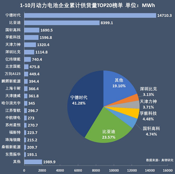 前10个月累计,供货量TOP20动力电池企业年合计总供货33.65GWh,占同期装机总量的94.42%,宁德时代与比亚迪两家就合计拿下64.85%的市场份额,寡头格局已稳,其他企业的竞争压力剧增。