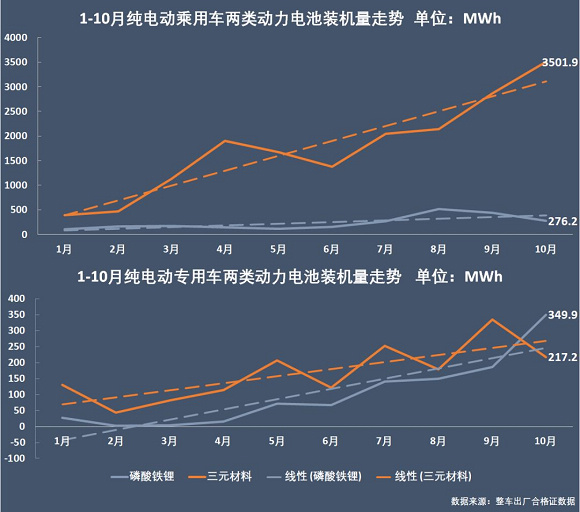 从各类车型搭载的动力电池类型看,纯电动乘用车以三元材料电池为主导,而在纯电动专用车市场上,磷酸铁锂电池年内总体装机走势强于三元材料电池。