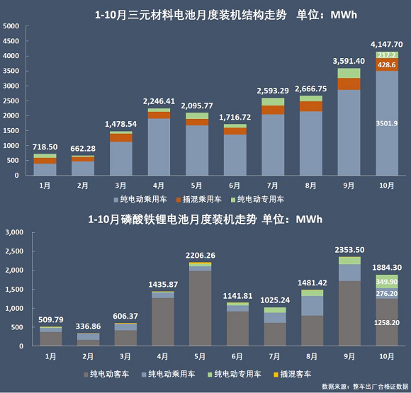 10月磷酸铁锂电池走弱,根本原因是纯电动客车市场低迷,在纯电动乘用车上的搭载量亦下降明显,而三元电池装机量的增长,依然是来自乘用车的拉动。