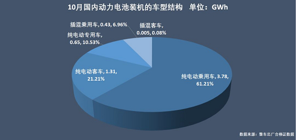 10月份国内动力电池装机量为6.13GWh,同比增长110.58%,实现翻番;但受本月新能源客车动力电池装机量减少的影响,月度增势放缓至1.97%。10月新能源乘用车装机量同比增长了235.8%;新能源客车装机量同比仅增长29.11%,而纯电动专用车装机量则较去年同期减少了5.37%。