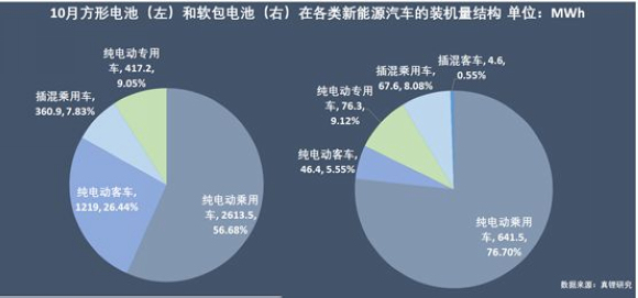 具体到车型领域,10月方形电池的56.68%搭载于纯电动乘用车,装机量2.614GWh;26.44%的搭载于纯电动客车,装机量1.219GWh。软包电池额76.7%搭载于纯电动专用车,装机量641.5MWh;9.12%的搭载于纯电动专用车,算是软包电池的第二大细分装机车型市场,装机量只有76.3MWh。