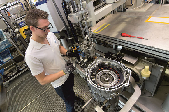 为乘用车制造的采埃孚8挡插电式混合动力变速箱在采埃孚位于德国萨尔布吕肯的工厂进行生产