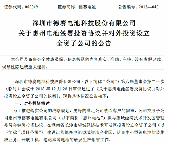 12月26日,德赛电池(000049)发布公告称,公司控股子公司惠州市德赛电池有限公司(下称“惠州电池”)拟与望城经济技术开发区管理委员会签署投资协议,在湖南省长沙市望城经济技术开发区投资设立全资子公司(下称“项目公司”),建设运营德赛电池望城智造产业园,从事中小型锂电池封装集成业务,开展手机、笔记本等电池的研发生产销售工作。