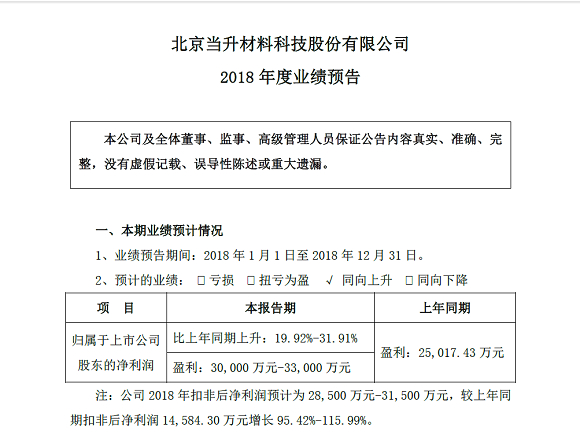 2019年1月7日晚间,当升科技(300073)发布2018年业绩预告显示,报告期内公司预计归属于上市公司股东的净利润为3-3.3亿元,同比上涨19.92%-31.91%。