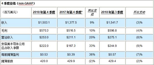 日前,安森美半导体公司宣布,2018年第4季度总收入为1,503.1百万美元,较去年同一季度上升约9%。2018年第4季度的收入较2018年第3季度下跌约3%。