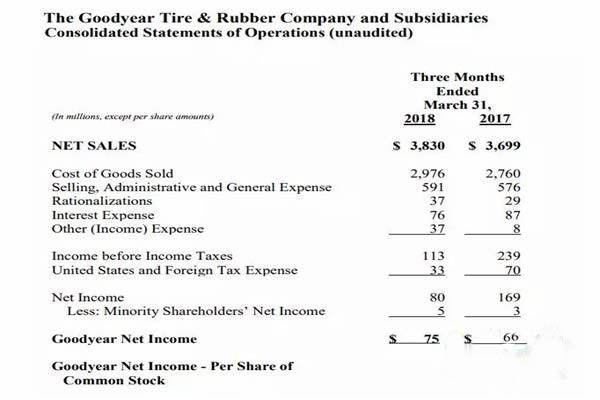 2018年4月25日,美国轮胎制造商固特异公布其第一季度财报。财报显示第一季度固特异: