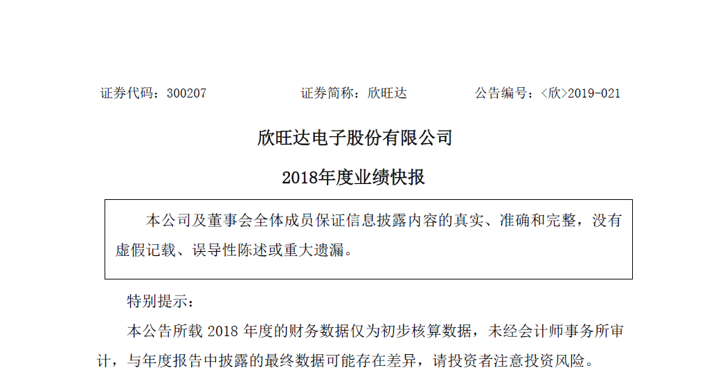 欣旺达(300207)发布2018年度业绩快报,报告期内,公司实现营收202.58亿元,比上年同期增长44%;归属于上市公司股东的净利润7.04亿元,比上年同期增长29%。