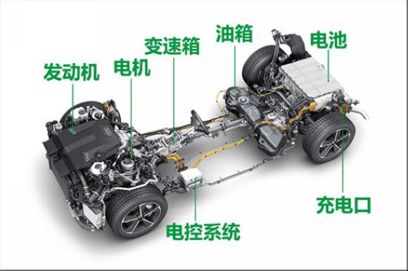 在车辆底盘中部布置有电控系统,其控制电动机的运转情况,电机可以单独驱动车辆,也可以与发动机动力进行耦合,共同驱动车辆。