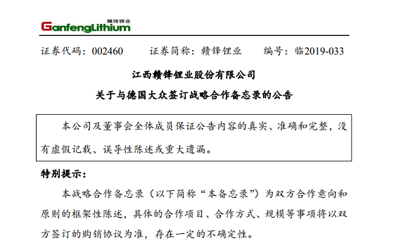 2019年4月9日,赣锋锂业发布公告,近日,公示与 德国大众签订了《战略合作备忘录》,根据备忘录,公司未来十年将向德国大众及其供应商供应锂化工产品。