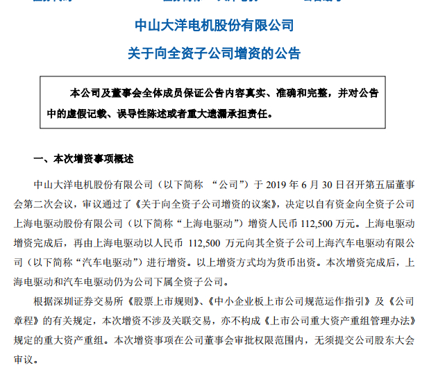 中山大洋电机股份有限公司发布关于向全资子公司增资的公告,公告称中山大洋电机股份有限公司(以下简称 “公司”)于2019年6月30日召开第五届董事会第二次会议,审议通过了《关于向全资子公司增资的议案》,决定以自有资金向全资子公司上海电驱动股份有限公司(以下简称“上海电驱动”)增资人民币112500 万元。上海电驱动增资完成后,再由上海电驱动以人民币112500 万元向其全资子公司上海汽车电驱动有限公司(以下简称“汽车电驱动”)进行增资。以上增资方式均为货币出资。