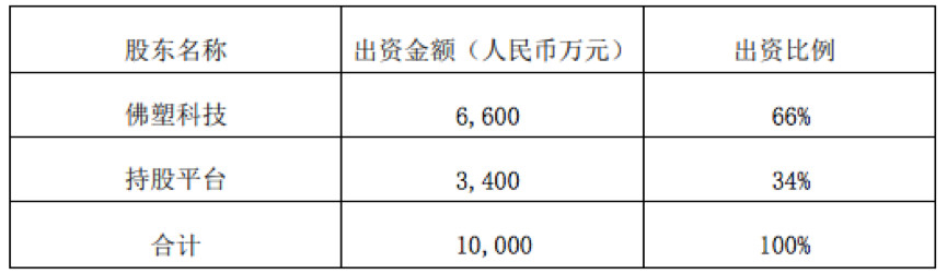 项目合资公司注册资本1亿元,其中,佛塑科技出资6600万,占股66%,持股平台出资3400万,持股34%。