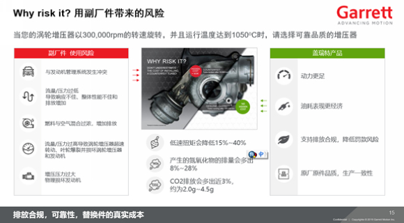“何必要冒风险?”盖瑞特在售后市场做的广告宣传词说到司机心坎里去了。从零配件长周期成本核算来看,拥有65年汽车涡轮增压经验的盖瑞特,还是建议大家在涡轮增压器出现问题时,购买原厂配件。毕竟定制开发的策略让盖瑞特涡轮增压器能避免与发动机系统不匹配,发动机动力更足,每一台增压器都是和一个发动机相匹配,油耗表现更加经济。
