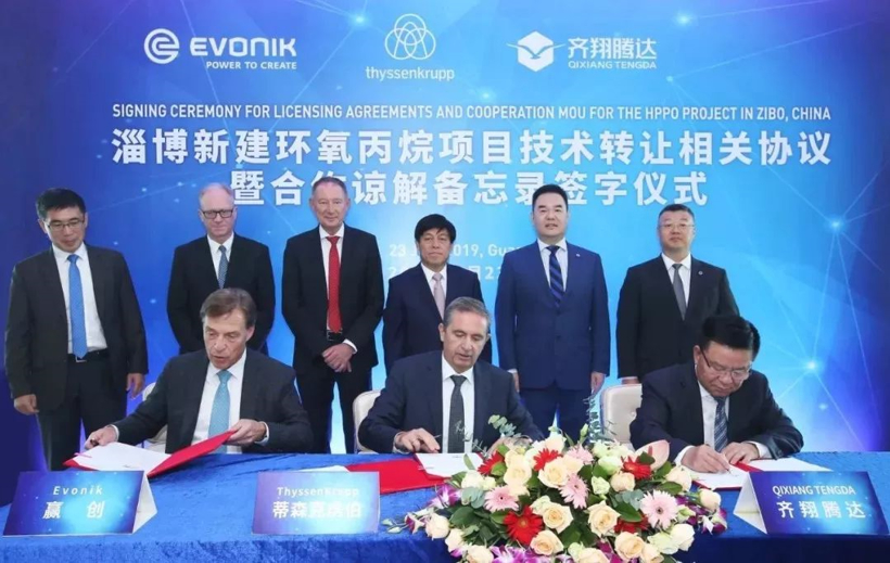 近日,蒂森克虏伯和赢创与淄博齐翔腾达化工有限公司(简称齐翔腾达)签署了过氧化氢制环氧丙烷(HPPO)工艺许可和技术服务协议。签约仪式在广州举行。