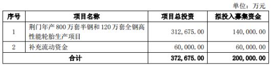扣除发行费用后,这笔款项将用于荆门年产800万套半钢和120万套全钢高性能轮胎生产项目,以及补充流动资金。