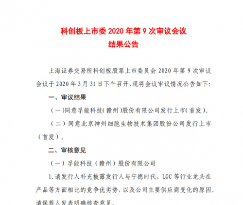 3月31日,上海证券交易所科创板股票上市委员会发布2020年第9次审议会议结果公告,同意孚能科技(赣州)股份有限公司发行上市(首发)。若成功上市,该公司将成为第一家登陆科创板的动力电池企业。