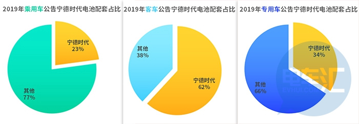 据电车汇数据智库统计,2019年全年各大车企共申报了2247款新能源汽车,其中宁德时代电池配套了989款,占比达44%,其中宁德时代乘用车配套占比23%、客车配套占比62%、专用车配套占比34%。
