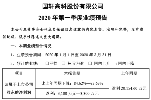 4月29日讯 国轩高科昨晚公布了2020年一季度业绩报告,公司预计2020年第一季度实现净利润3,100万元至3,300万元,较上年同期下降83.63%至84.62%。